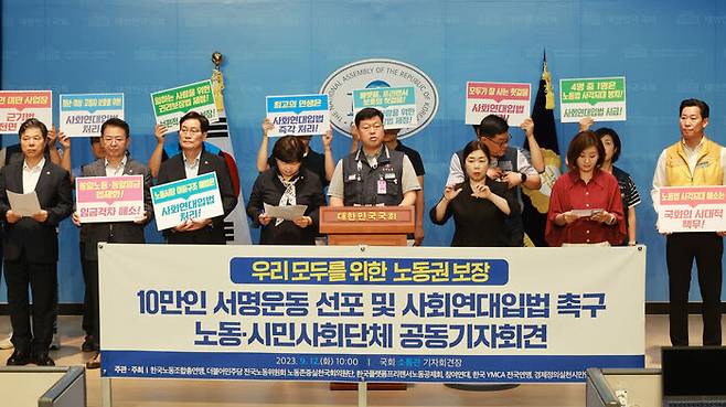 지난 12일, 한국노총을 비롯한 노동시민사회단체와 야당은 국회에서 ‘사회연대입법 촉구’ 기자회견을 열었습니다. 중년의 노조 관계자, 야당 정치인들 사이에 30대 초반의 청년 활동가가 자리했습니다. ‘진보’를 표방하는 사회·정치 세력이 추진하는 노동입법 촉구 기자회견에서 그는 이렇게 말문을 열었습니다.