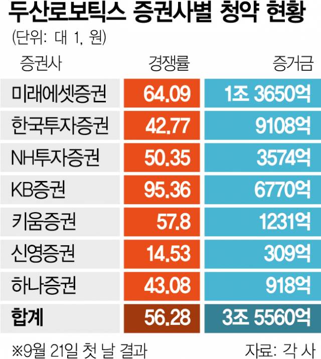 21일 투자은행(IB) 업계에 따르면 국내 증권사 7곳이 이날 일반 투자자 대상 두산로보틱스 공모주 청약을 실시한 결과 총 청약 건수가 59만 6518건에 달해 56.3대1의 경쟁률을 기록했다. 주문액의 절반을 미리 납부하는 청약 증거금은 약 3조 5560억 원이 들어왔다. 청약 건수와 증거금 모두 청약 첫날 기준 올해 IPO 투자로는 최대다.