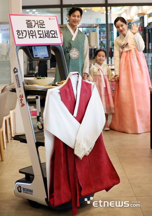 LG유플러스는 21일 추석 명절을 앞두고 경부고속도로 천안삼거리휴게소(상행) 내 식당에서 한복차림의 U+ 서빙로봇을 선보였다.