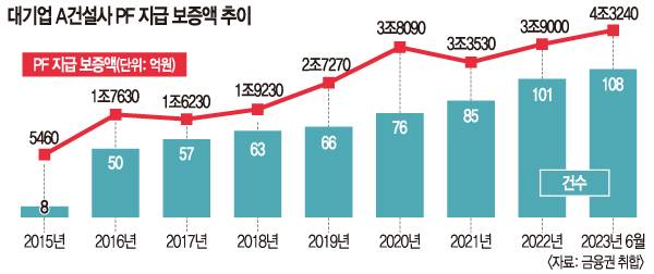 ‘우발 채무’에 해당하는 A건설사의 PF 대출 지급 보증액은 올해 6월 말 기준 4조3240억원에 이른다. 2015년 PF 대출 지급 보증액은 5460억원에 불과했는데 8년 반 새 4조원 가까이 늘어났다. 이 중 2170억원어치의 만기가 이달 말, 2420억원어치가 오는 12월 말 도래한다. 해당 PF 대출 만기가 연장되거나 금융 시장에서 원만히 차환되지 않으면 A건설사가 떠안아야 한다. A건설사는 이달 중순에도 부동산 시행 자회사가 1530억원 규모의 PF 대출 유동화 증권을 차환하는 데 실패하자 직접 매입한 바 있다. 이후에도 A건설사가 지급 보증한 PF 대출 만기는 2024년 8990억원, 2025년 1920억원 등 줄줄이 돌아올 예정이다.