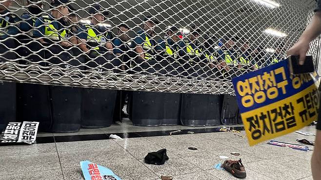 경찰과 서울메트로 9호선은 이날 오후 국회 정문 인근 국회의사당역 1번·6번 출구에 경찰관 등 인력을 배치해 국회 방향 진출을 차단했습니다.