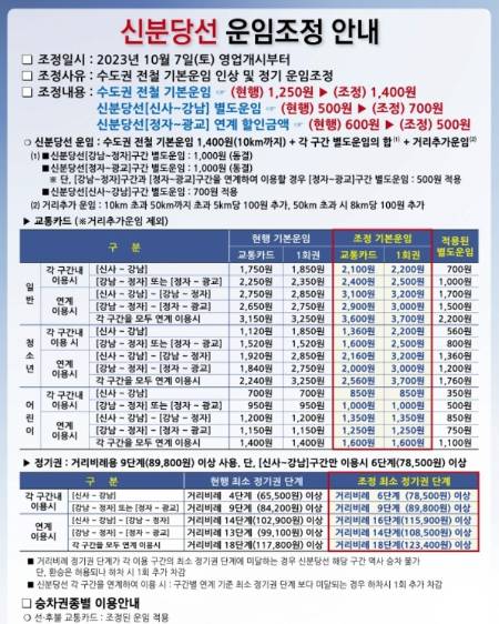 서울 강남과 분당·판교, 수원 광교 등을 잇는 지하철 신분당선의 요금이 다음 달인 10월 7일부터 교통카드 기준 최대 450원 오른다.
