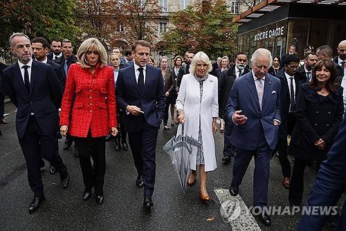 epa10874184 Britain's King Charles III (2-R) and his wife, Queen Camilla (C-R), French President Emmanuel Macron (C-L) and first lady Brigitte Macron (2-L) visit the Notre-Dame Cathedral rebuilding site in Paris, France, 21 September 2023. The British royal couple's three-day state visit was initially planned for March 2023 and postponed due to widespread demonstrations in France against the government's pension reforms. EPA/Christophe Petit Tesson / POOL