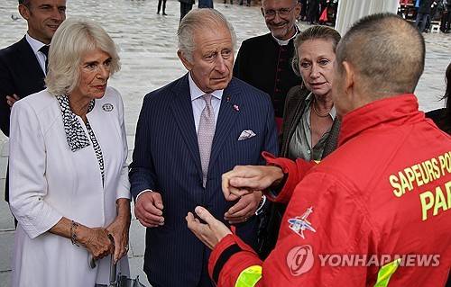 epa10874164 Britain's King Charles III (C) and his wife Camilla (L) meet firefighters during a visit on the Notre-Dame Cathedral rebuilding site in Paris, France, 21 September 2023. The British royal couple's three-day state visit was initially planned for March 2023 and postponed due to widespread demonstrations in France against the government's pension reforms. EPA/Christophe Petit Tesson / POOL