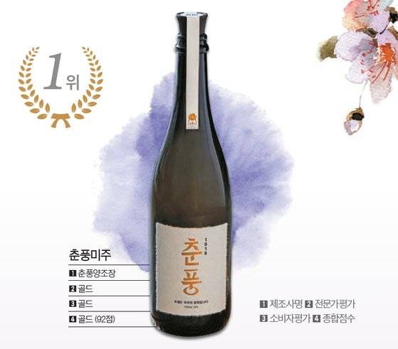 통합 1위를 한 제품은 춘풍양조장의 ‘춘풍미주’다. 출품작 중에 가장 가격대가 높은 막걸리(5만5천 원)로 전문가 91점, 소비자 92점, 통합 92점을 받았다. 와인 전문가인 엄경자 세종사이버대 교수는 “바닐라와 감귤 향이 나면서 깔끔한 산도와 당도가 균형을 이루고 오미자처럼 다섯 가지 맛이 난다”고 평했다. 비슷한 평가로 100점을 준 소비자 평가단도 있었다.