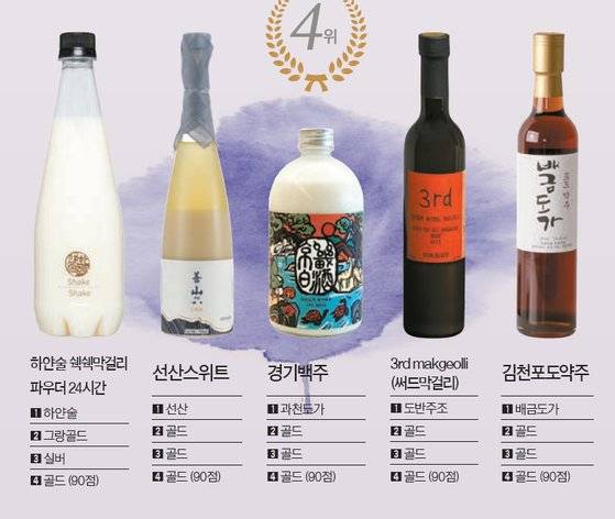 통합 4위는 90점을 받은 배금도가의 ‘김천포도약주’, 선산의 ‘선산스위트’, 도반주조의 ‘3rd makgeolli(써드막걸리)’, 과천도가의 ‘경기백주’ 그리고 앞서 언급한 ‘얼떨결에 옐로’와 ‘하얀술 쉑쉑막걸리 파우더 24시간’다. 그중 ‘3rd makgeolli(써드막걸리)’는 산미가 상대적으로 강해 신선하며, 쓴맛과 타닌감이 절묘하게 어우러진다는 평이 많았다.
