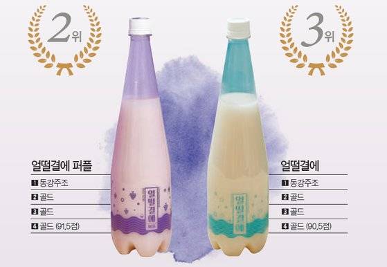통합 2위와 3위는 동강주조가 휩쓸었다. ‘얼떨결에 퍼플’(전문가 93점, 소비자 90점)과 ‘얼떨결에’(전문가 90점, 소비자 91점)가 각 91점을 받았다. 또 ‘얼떨결에 옐로’(전문가 91점, 소비자 89점)까지 통합 90점을 받아 동강주조 3개 제품이 모두 통합순위에서 골드를 수상하는 저력을 발휘했다. ‘얼떨결에 퍼플’을 맛본 안혜성 와인 전문가는 “산딸기 같은 붉은 베리 향이 입안에서 맴돌고 감미가 적당해 과하지 않다”며 높은 점수를 줬다. 또 2명의 소비자 평가단은 구매의향을 묻는 질문에 100점 만점을 줬다.