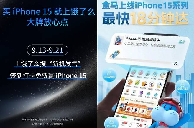 알리바바의 신선식품 배달 전문 플랫폼인 허마 역시 오는 22일부터 아이폰15를 판매한다고 발표한 뒤 "주문에 성공할 경우 빠르면 18분 이내에 새 기기를 받을 수 있다"며 고객 유치전에 가세했습니다.
