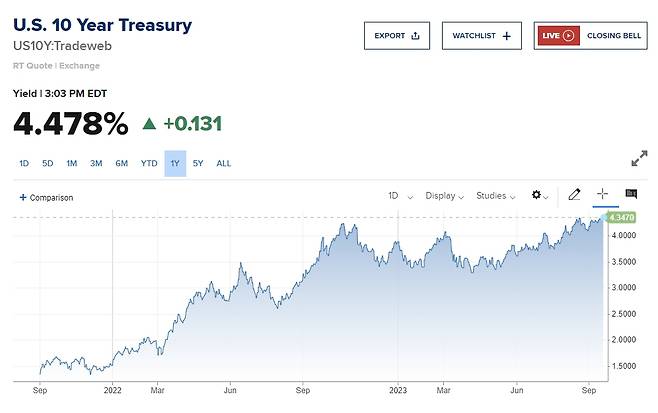 연방준비제도(Fed)가 전일 연내 한 차례 더 금리를 올릴 수 있다고 발표한 이후 국채시장에선 장기채 금리가 치솟았다. 10년 만기 국채 수익률은 15년여 만에 최고치인 4.48%를 기록했다.