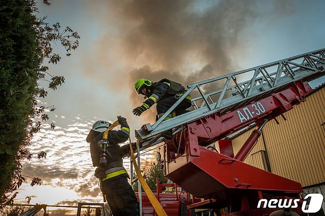 하르키우서 화재 진압하는 우크라이나 소방관들