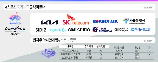 e스포츠 '초대 금메달' 여정 돕는 기업들 유니폼 중앙에 공식 후원사 기아 로고 SKT, 3년간 e스포츠 국가대표 후원 대한항공·우리금융도 파트너십 체결 응원 이벤트 펼친 넥슨·라이엇게임즈 "식빵 잊어라" 식단 관리까지 나선 협회