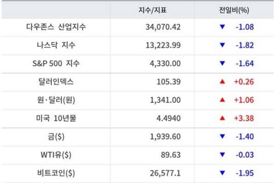 [특징주] ■기술주 기술주가 하락했다. 애플 0.89%, 마이크로소프트 0.39%, 엔비디아 2.89%, 알파벳 2.47%, 아마존 4.41%, 메타 1.31% 하락했다.