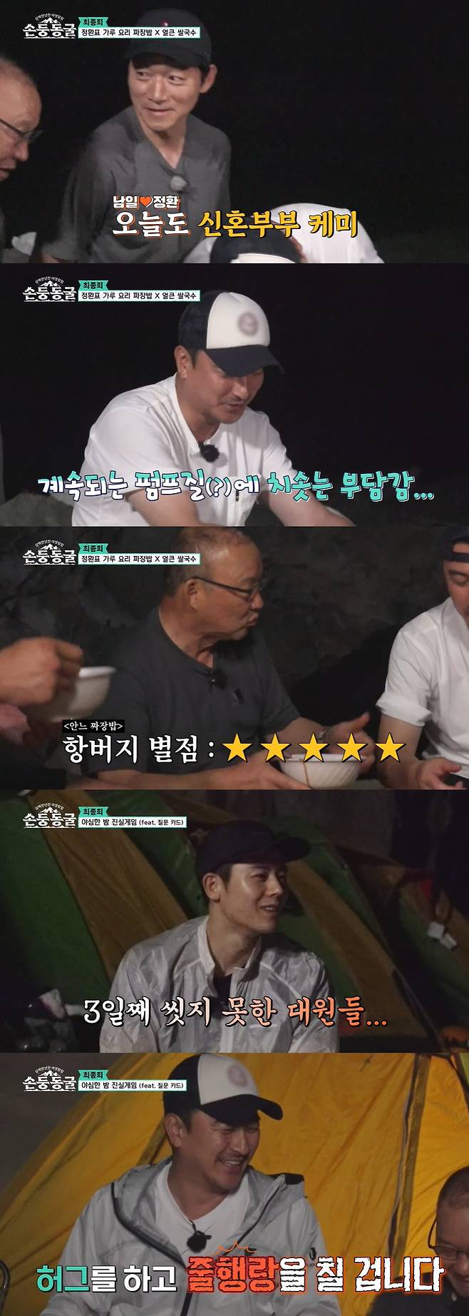 식사 후, 멤버들은 제작진이 준비한 '질문 카드'에 답하는 시간을 가졌다. '동굴에서 나가면 가장 먼저 하고 싶은 일'에 대해 김동준은 "소소한 건데 사우나하러 갔다가 바나나우유 먹듯이 동굴에서 나갔을 때 정말 시원한 걸 벌컥벌컥 마시고 싶다"고 밝혔다. 박항서는 때를 밀고 싶다고 말했고 추성훈은 휴대폰으로 바깥 세상을 보고 싶다고 말했다. 이에 안정환은 "여러분들은 참 소박하다. 나는 나가자마자 여러분들과 포옹을 하고 싶다"며 "진심이다. 다신 안 볼 거기 때문에 포옹하고 줄행랑 칠 것"이라 밝혀 웃음을 안겼다.