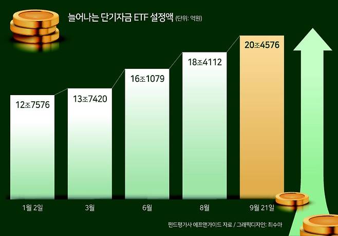 22일 펀드평가사 에프앤가이드에 따르면, 단기자금 ETF의 총 설정액은 20조4576억원(21일 기준)으로 집계됐다.