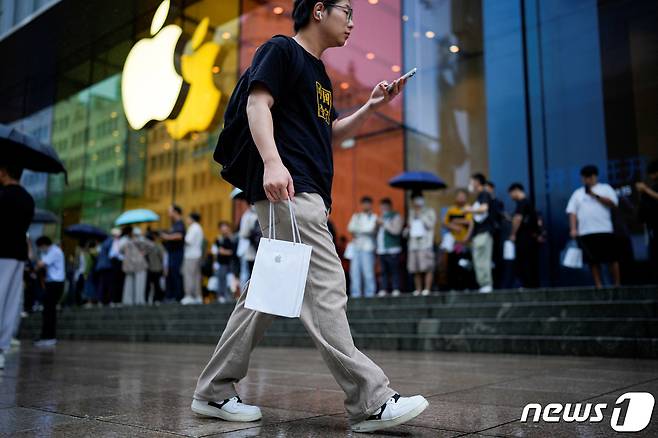 (상하이 로이터=뉴스1) 장성희 기자 = 22일(현지시간) 중국 상하이에서 한 남성이 애플 로고가 그려진 종이가방을 들고 걸어가고 있다. 이날 중국 전역에서 애플의 신형 아이폰15가 공식 판매에 돌입했다. 2023.09.22/