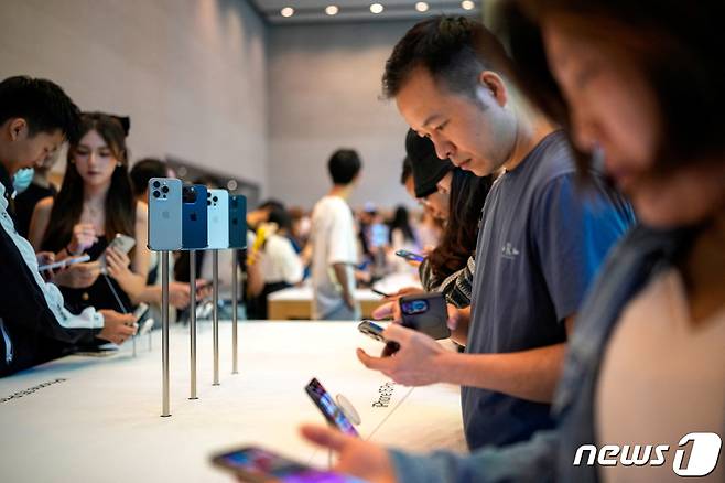 (상하이 로이터=뉴스1) 장성희 기자 = 22일(현지시간) 중국 상하이의 한 애플 매장에서 사람들이 아이폰15 프로를 구경하고 있다. 이날 중국 전역에서 애플의 신형 아이폰15가 공식 판매에 돌입했다. 2023.09.22/