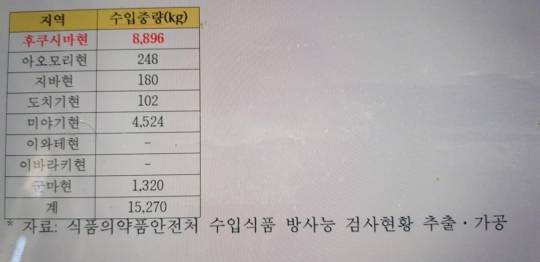 원전 사고 지역인 후쿠시마현에서 제조·생산된 제품이 8.9t으로 가장 많았고, 바로 위에 있는 미야기현이 4.5t으로 뒤를 이었다.