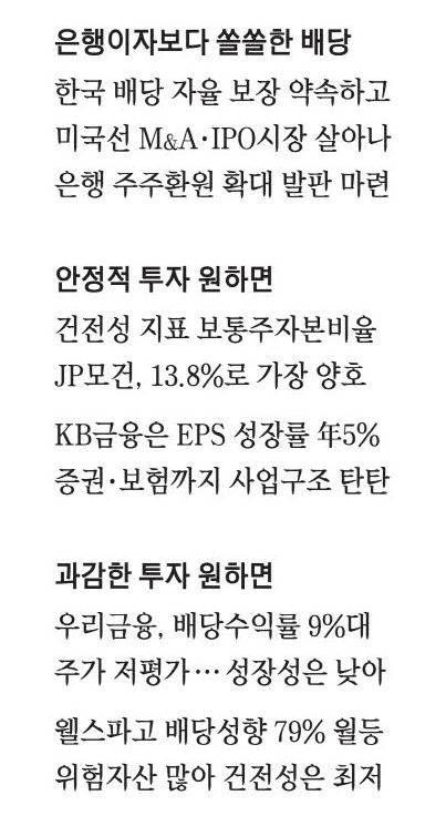 JP모건과 KB금융은 리스크 관리가 잘돼 있고 지속 성장 가능성이 높아 상대적으로 안정적인 주식으로 꼽힌다. 우리금융지주는 높은 배당수익률에 비해 주가는 상대적으로 낮아 배당 수익을 노리는 사람들의 관심을 끌고 있다.