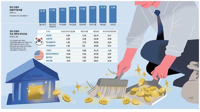 순익 대비 배당금이자 배당 의지를 대표하는 배당성향도 5년 평균(2019~2023년) 24.65%로 낮은 편이다. 실제 국내 4대 지주의 배당성향은 24~25%에 그치고 있다. 미국 은행 중 가장 낮은 곳은 BoA(27.56%)다.
