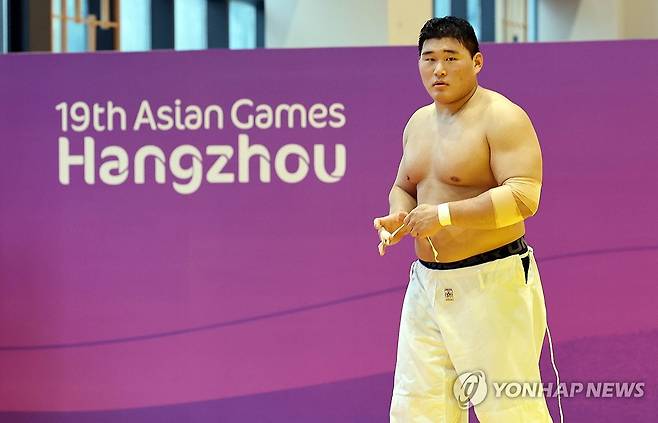 (항저우=연합뉴스) 형민우 기자 = 유도 국가대표 김민종이 22일 중국 저장성 항저우 샤오산 린푸 체육관에서 아시안게임을 앞두고 훈련을 하고 있다. 2023.9.22