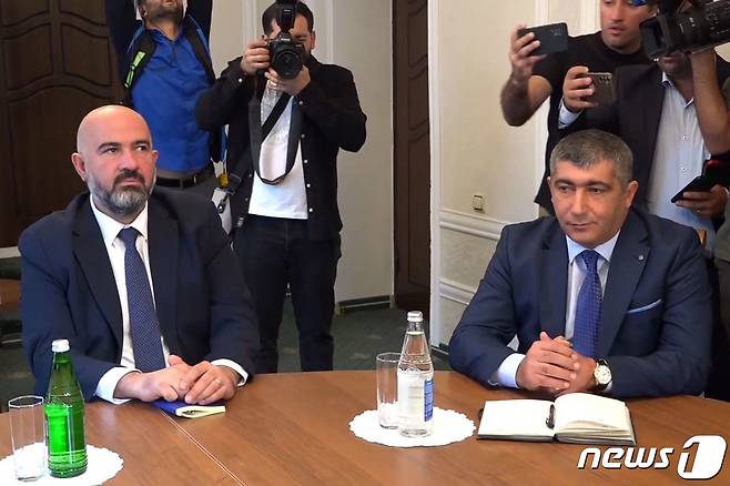 (예블라크 AFP=뉴스1) 장성희 기자 = 21일(현지시간) 아제르바이젠 예블라크에서 아제르바이젠 대표단과 카라바흐 대표단이 회담을 위해 만난 모습이다. 2023.09.21/