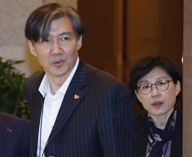 | ▲ 2019년 4월 1일 당시 조국 민정수석(왼쪽)과 조현옥 인사수석이 오전 청와대 여민관에서 열린 수석·보좌관 회의에 입장하고 있다. |