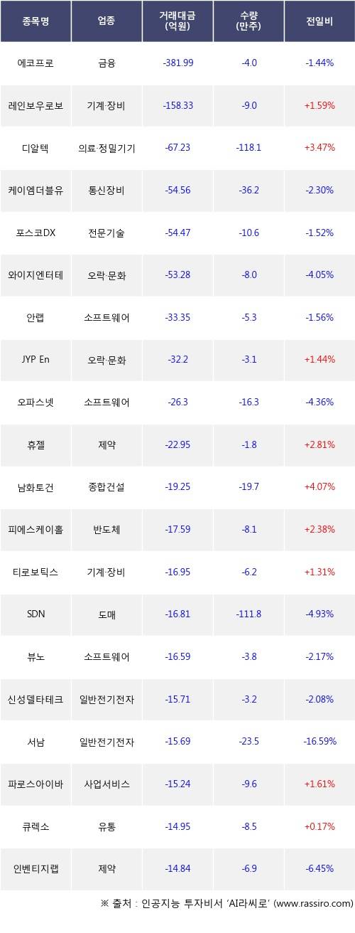외국인 투자자의 순매도 상위 20개 종목은 에코프로, 레인보우로보틱스, 디알텍, 케이엠더블유, 포스코DX, 와이지엔터테인먼트, 안랩, JYP Ent., 오파스넷, 휴젤등이다.