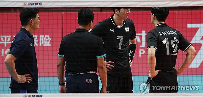 (항저우=연합뉴스) 김인철 기자 = 22일 중국 항저우 사오싱 차이나 텍스타일 시티 스포츠센터에서 열린 19회 항저우 아시안게임 남자배구 12강 토너먼트 한국과 파키스탄의 경기. 파키스탄의 공격하는 공에 얼굴을 맞은 한국 허수봉이 통증을 가라앉히고 있다. 2023.9.22