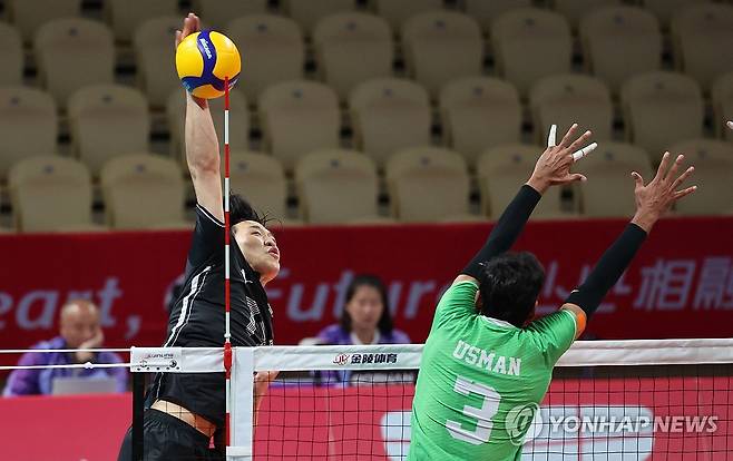 (항저우=연합뉴스) 김인철 기자 = 22일 중국 항저우 사오싱 차이나 텍스타일 시티 스포츠센터에서 열린 19회 항저우 아시안게임 남자배구 12강 토너먼트 한국과 파키스탄의 경기. 한국 임동혁이 공격을 시도하고 있다. 2023.9.22
