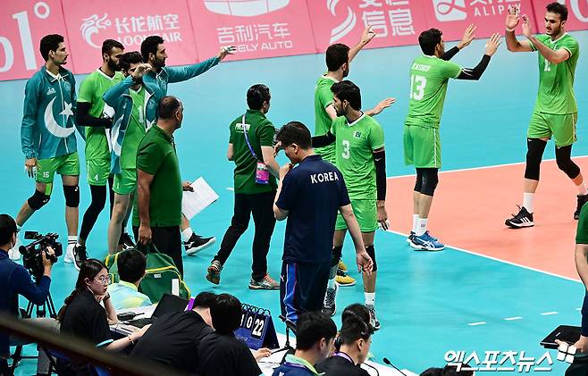 (엑스포츠뉴스 샤오싱(중국), 김한준 기자) 22일 오후 중국 저장성 사오싱 중국 섬유 도시 스포츠센터 체육관서 열린 2022 항저우 아시안게임 남자배구 대한민국과 파키스탄의 12강전 경기, 대한민국 임도헌 감독이 2세트를 내준 뒤 이동하고 있다.