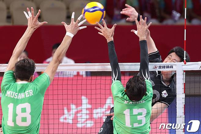 (샤오싱(중국)=뉴스1) 신웅수 기자 = 22일 오후 중국 샤오싱 차이나 텍스타일 시티 스포츠센터에서 열린 남자 배구 12강 토너먼트 대한민국과 파키스탄의 경기에서 나경복이 공격을 하고 있다. 2023.9.22/뉴스1