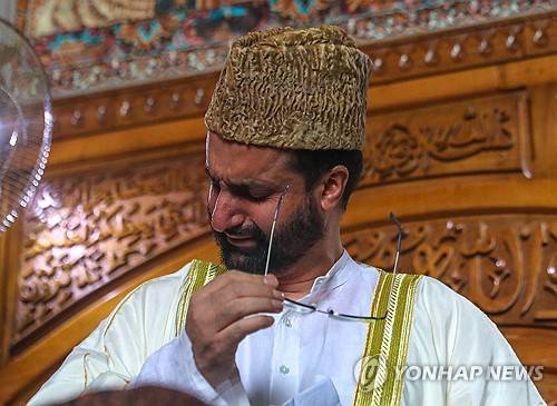 epa10876541 Mirwaiz Moulvi Umar Farooq, the main Imam of Kashmir, breaks down into tears as he steps on the Mimbar (pulpit) of Jamia Masjid (Grand Mosque of Kashmir) in Srinagar, the summer capital of Indian Kashmir, 22 September 2023. The Mirwaiz delivered Friday sermon at the mosque after 4 years. He had been under house arrest since the abrogation of Article 370 of the Constitution of India on 5 August 2019. Mirwaiz also heads the moderate faction of the All Parties Hurriyat (Freedom) Conference. Kashmir-based political parties have welcomed his release. EPA/FAROOQ KHAN