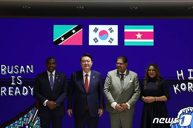 (서울=뉴스1) 안은나 기자 = 윤석열 대통령이 21일 오후(현지시간) 미국 뉴욕에서 열린 한·카리브공동체(카리콤·CARICOM) 국가 정상만찬에서 찬드리카퍼사드 산토키 수리남 대통령 부부, 티모시 해리스 세인트키츠네비스 총리와 기념 촬영하고 있다. (대통령실 제공) 2023.9.22/뉴스1