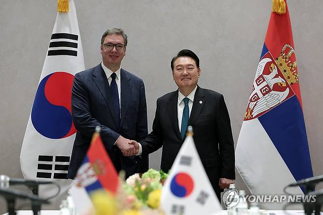 (뉴욕=연합뉴스) 임헌정 기자 = 미국을 방문 중인 윤석열 대통령이 22일(현지시간) 뉴욕에서 열린 한·세르비아 정상회담에서 알렉산다르 부치치 세르비아 대통령과 기념촬영을 하고 있다. 2023.9.23 [공동취재]