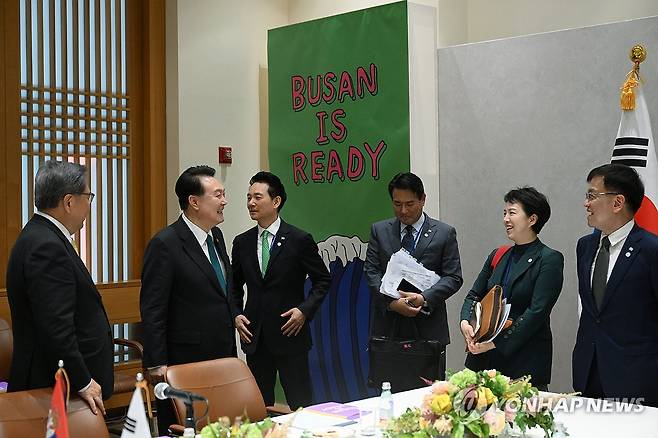 (뉴욕=연합뉴스) 임헌정 기자 = 미국을 방문 중인 윤석열 대통령이 22일(현지시간) 뉴욕에서 열린 한·세르비아 정상회담에 앞서 김은혜 홍보수석, 최상목 경제수석 등과 대화하고 있다. 2023.9.23 [공동취재]