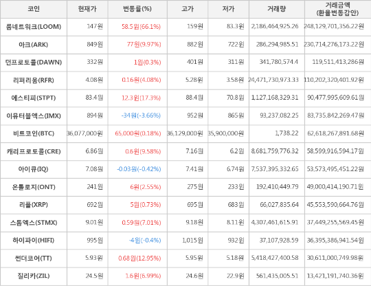 또한, 에스티피(17.3%, 83.4원), 썬더코어(12.95%, 5.93원), 아크(9.97%, 849원), 캐리프로토콜(9.58%, 6.86원), 스톰엑스(7.01%, 9.01원), 질리카(6.99%, 24.5원), 리퍼리움(4.08%, 4.08원), 온톨로지(2.55%, 241원), 리플(0.73%, 692원), 던프로토콜(0.3%, 332원)이 상승세를 나타냈다.