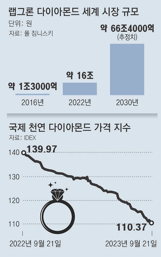 다이아몬드 시장조사업체 폴 짐니스키에 따르면 전 세계 랩그론 다이아몬드 시장 규모는 2016년 10억 달러(약 1조3000억 원)에 못 미쳤으나 2030년까지 약 499억 달러(약 66조4000억 원)까지 커질 것으로 보고 있다.