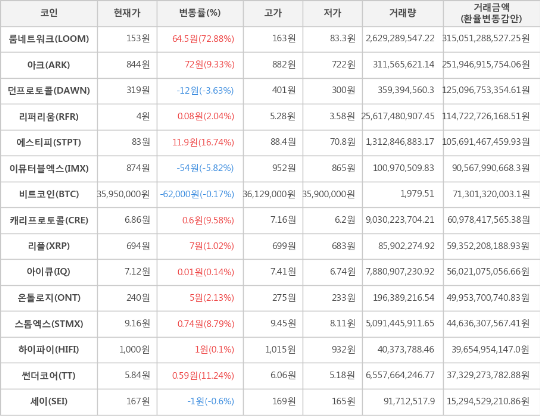 또한, 에스티피(16.74%, 83원), 썬더코어(11.24%, 5.84원), 캐리프로토콜(9.58%, 6.86원), 아크(9.33%, 844원), 스톰엑스(8.79%, 9.16원), 온톨로지(2.13%, 240원), 리퍼리움(2.04%, 4원), 리플(1.02%, 694원), 아이큐(0.14%, 7.12원), 하이파이(0.1%, 1,000원)가 상승세를 나타냈다.