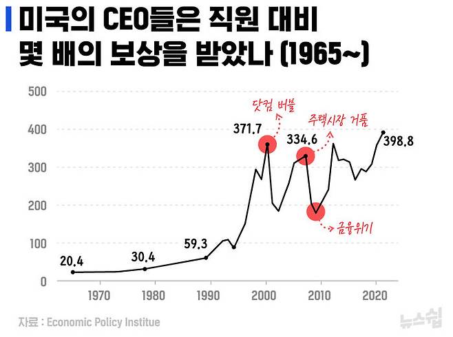 미국 기업의 이익은 사상 최고 수준이고 CEO들의 보상도 그만큼 늘었는데 노동자의 몫은 부당하게 적다는 주장은 미국의 상당수 주류 경제학자들도 인정하는 부분이다. 데이터로도 나타난다. 다음의 그래프들이 우상향 또는 우하향 하는 방향만 대략 봐도 그렇다.