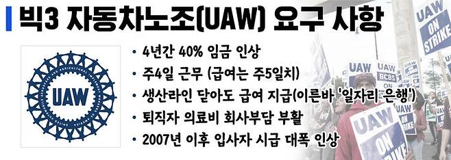 4년간 40% 임금인상 요구는 빅3 CEO들이 받아간 보상(대부분 주식 관련)이 4년간 그만큼 늘었으니 같은 수준으로 인상률을 맞춰달라는 것이다. 전미자동차노조(UAW)는 회사가 그동안 돈을 많이 벌었으면서도 노동자에게는 제 몫을 나눠주지 않았다고 주장한다. 빅3는 합쳐서 올해 상반기에 2백10억 달러의 이익을 낸 것으로 추산되고 지난 10년간 미국에서 거둔 이익은 2천5백억 달러에 이르는데, 지난 4년간 노동자 임금은 겨우 6% 올려줬다는 것이다.