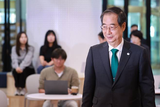 [한덕수 국무총리가 19일 정부서울청사 별관에서 열린 출입기자 간담회에 참석하고 있다. (사진=연합뉴스)]