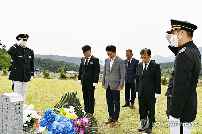 (대전=연합뉴스) 23일 오전 대전 유성구 국립대전현충원을 방문한 박민식 국가보훈부 장관이 지난 7월 순직한 고 채수근 상병의 묘소를 찾아 참배하고 있다. 2023.9.23 [국립대전현충원 제공. 재판매 및 DB 금지]