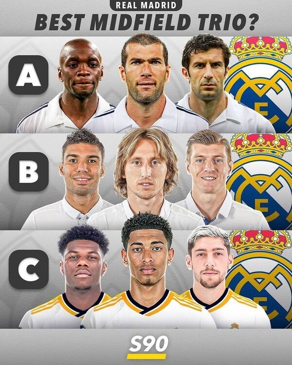 축구 매체 ‘스코어90’은 22일(이하 한국시간) SNS를 통해 레알의 중원 조합을 평가하는 게시물을 올렸다. ‘스코어90’은 레알의 중원을 세대 별로 묶었다. 1세데는 클로드 마켈렐레, 지네딘 지단, 루이스 피구였고 2세대는 토니 크로스, 카세미루, 루카 모드리치였다. 현재 중원은 오렐리앵 추아메니, 주드 벨링엄, 페데리코 발베르데다.