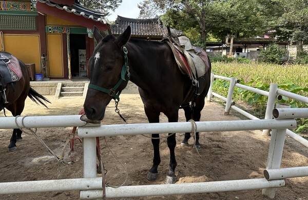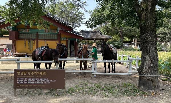 이왕 민속촌에 온 김에 다른 곳도 살펴봤다. 과거 귀신의 집은 귀굴 체험으로 달라졌다. 야간 시간에는 살귀옥 체험을 할 수 있는데 기회가 되면 한 번 방문할 예정이다. 승마장도 여전히 남아있다. 말이 피곤한지 자고 있었다.