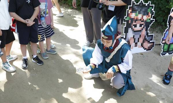 바람:연 행사는 두더지 잡기부터 시작한다. 망치로 올라오는 두더지를 때려잡는 아케이드 게임도 정말 오랜만이다. 다리를 건너자 도깨비가 어린이들과 인사하는 모습을 볼 수 있었다.