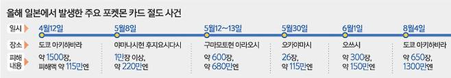 지난 4월 아키하바라의 한 가게에서 포켓몬 카드 1500장가량이 털렸다. 피해액은 약 115만엔(1000만원)으로 집계됐다. 5월에는 구마모토현 아라오시에서 피해액 680만엔(6100만원)에 이르는 사건이 발생했다. 다음 달에는 시가현 오쓰시에서 300장을 훔쳐가는 사건이 있었다.