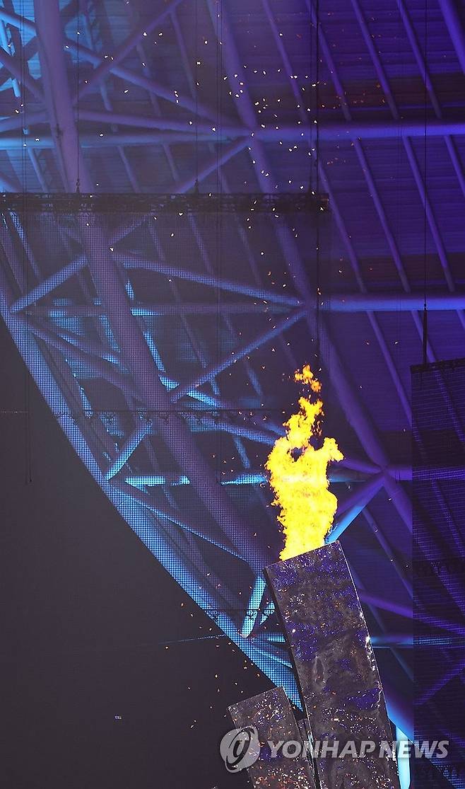 (항저우=연합뉴스) 김인철 기자 = 23일 오후 중국 항저우 올림픽 스포츠센터 스타디움에서 열린 2022 항저우 아시안게임 개회식에서 성화가 점화되고 있다. 2023.9.23