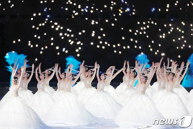 (항저우(중국)=뉴스1) 민경석 기자 = 23일 오후 중국 항저우 올림픽 스포츠센터 스타디움에서 열린 '2022 제19회 항저우 아시안게임' 개회식에서 축하 공연이 펼쳐지고 있다. 2023.9.23/뉴스1