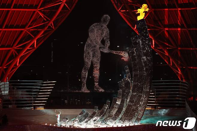 (항저우(중국)=뉴스1) 유승관 기자 = 23일 오후 중국 항저우 올림픽 스포츠센터 스타디움에서 열린 '2022 제19회 항저우 아시안게임' 개회식에서 도쿄 올림픽 수영 남자 200m 개인혼영 금메달리스트 왕순과 디지털 점화자가 함께 성화점화를 하고 있다. 2023.9.23/뉴스1