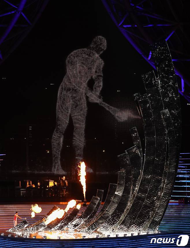 (항저우(중국)=뉴스1) 유승관 기자 = 23일 오후 중국 항저우 올림픽 스포츠센터 스타디움에서 열린 '2022 제19회 항저우 아시안게임' 개회식에서 도쿄 올림픽 수영 남자 200m 개인혼영 금메달리스트 왕순과 디지털 점화자가 함께 성화점화를 하고 있다. 2023.9.23/뉴스1